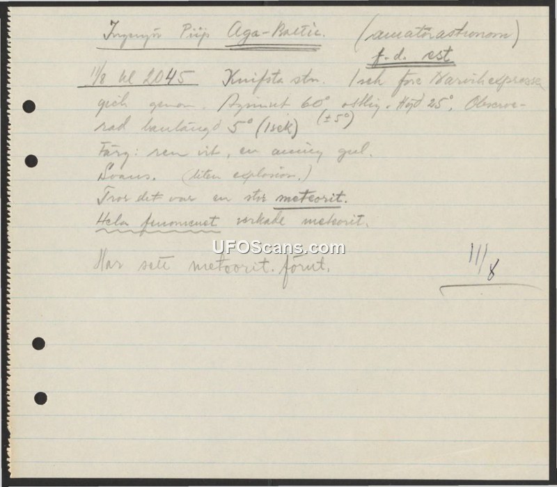 This document is a handwritten report detailing an aerial sighting observed on August 11 at 20:45 near the Knivsta station. The observer is identified as an engineer named Piip, who is also noted as an amateur astronomer associated with Aga-Baltic. The report describes an object that appeared at an azimuth of 60 degrees east and an altitude of 25 degrees. The observation lasted for approximately one second. The object was described as being pure white in color with a slight yellow tint, and the event was accompanied by a small explosion. Based on the observation, the witness concluded that the phenomenon was a large meteorite. The document also notes that the witness had observed a meteorite previously.