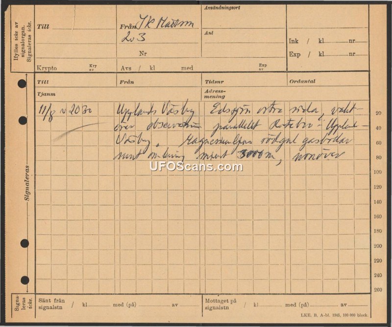 A 1945 Swedish military signal log reporting the observation of magnesium-colored gas spheres at 3000 meters altitude near Edssjön, Upplands Väsby.