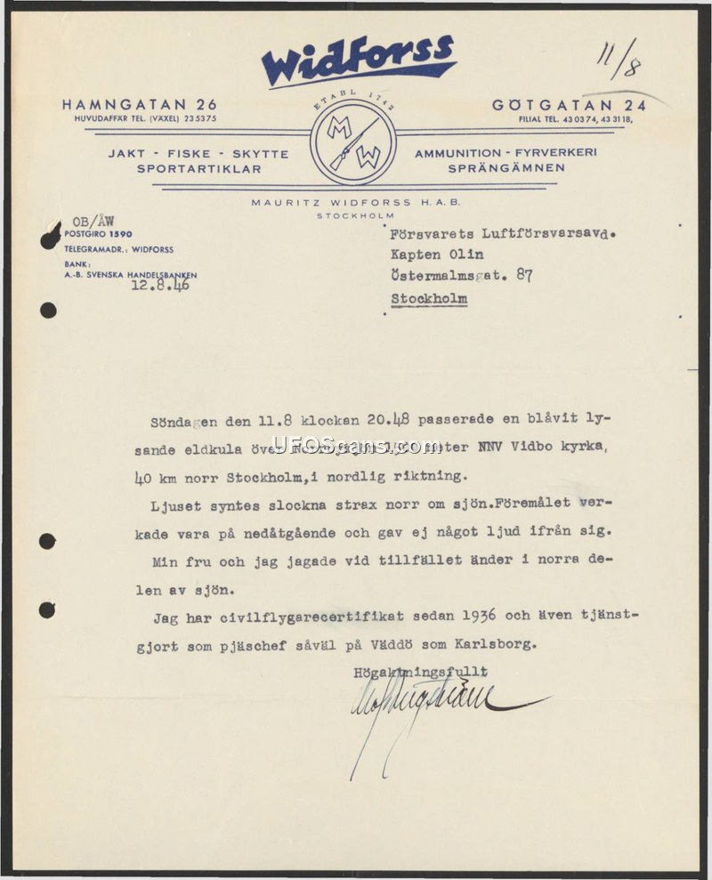 On August 12, 1946, an individual wrote to Captain Olin of the Swedish Armed Forces Air Defense Department to report an aerial sighting that occurred the previous evening. On Sunday, August 11, 1946, at 20:48, the author and his wife were hunting ducks in the northern part of Norrbysjön, located 40 kilometers north of Stockholm. During this time, they observed a blue-white glowing fireball passing over the lake in a northerly direction. The object was sighted 1500 meters north-northwest of Vidbo church. The witness noted that the object appeared to be descending and made no sound as it traveled. The light from the object appeared to extinguish just north of the lake. The author of the letter established his credibility by noting that he has held a civil pilot's certificate since 1936 and has served as a gunnery officer at both the Väddö and Karlsborg military installations.