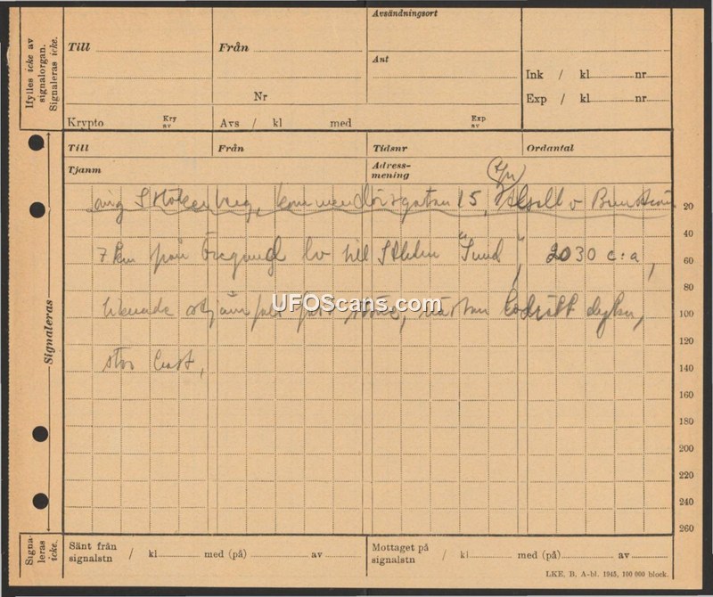 This document is a handwritten Swedish military-style communication form, likely a sighting report. It records an event occurring at 20:30 hours. The report describes a large object observed 7 kilometers from Fregang, moving toward a location identified as [illegible] Sund. The movement of the object is described as uneven and fast, with a trajectory characterized as an almost straight descent.