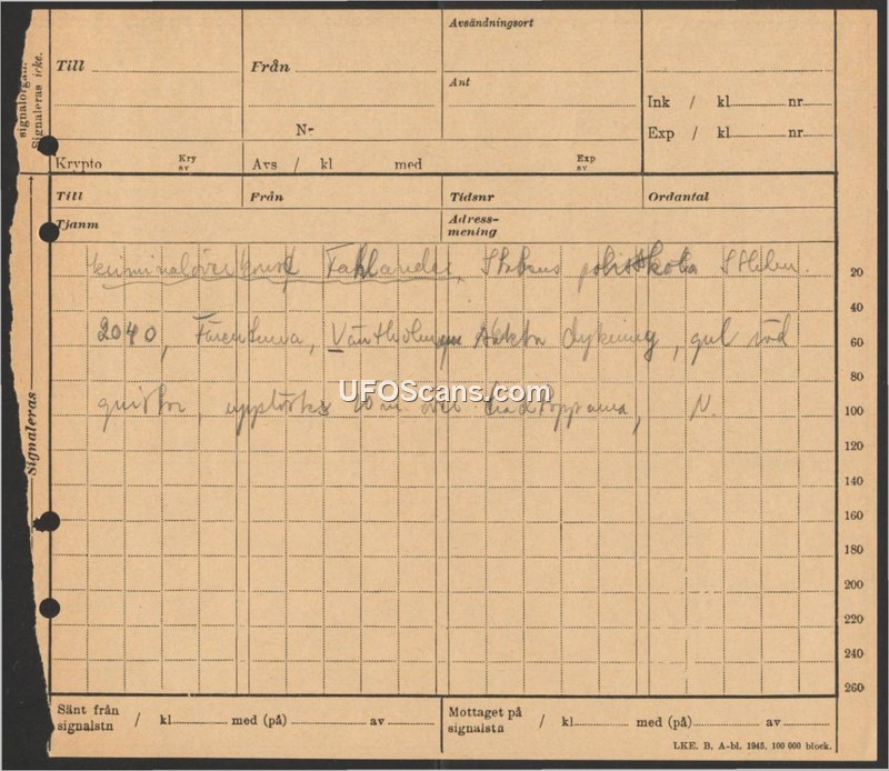 This document is a brief, handwritten field report, likely originating from or directed to the Stockholm Police School. The text records a sighting occurring at 20:40 at a location identified as Vantholmen. The observer reported seeing an object described as yellow and red in color, which was observed at an altitude of 20 meters above the treetops.