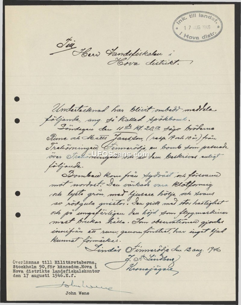 A 1946 report from the Hova district regarding a 'ghost bomb' sighting by two brothers in Finnerödja. The object was described as a silent, green, spherical craft with a spark-filled tail moving at high speed.