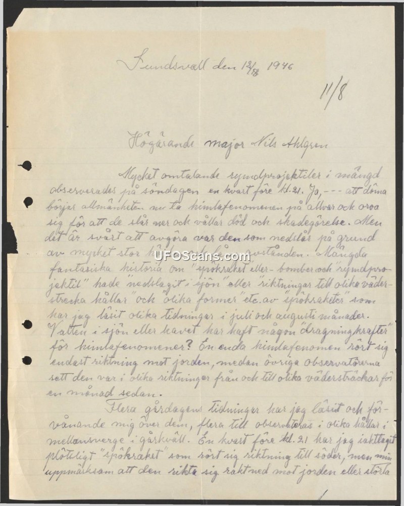 A 1946 letter to Major Nils Ahlgren documenting public concern over 'ghost rockets' in Sweden and providing a personal account of a sighting on August 11, 1946.