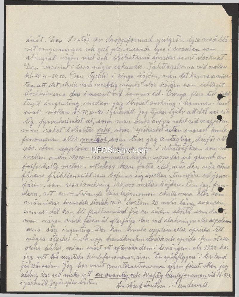 This document is a handwritten report by an amateur astronomer describing an unidentified aerial phenomenon observed in Sundsvall, Sweden, between 20:45 and 20:50 on the evening prior to the writing of the note. The witness describes the object as a drop-shaped, yellow-green light with blue-white surroundings and a pulsating yellow tail. The object flickered with small sparks before extinguishing after a few seconds. The witness estimates the altitude to be between 10,000 and 15,000 meters. While the witness acknowledges the appearance of the object, they explicitly state that it was not a 'ghost rocket' (spökraket), but rather a natural phenomenon, likely a meteor rich in phosphorus that ignited due to atmospheric friction. The witness notes that they have been an amateur astronomer for some time and have observed two other 'mystical sky phenomena' since 1928, including a 'ghost aircraft' in Norrland ten years prior. The author expresses that this specific sighting was the most powerful and unusual they had ever witnessed.