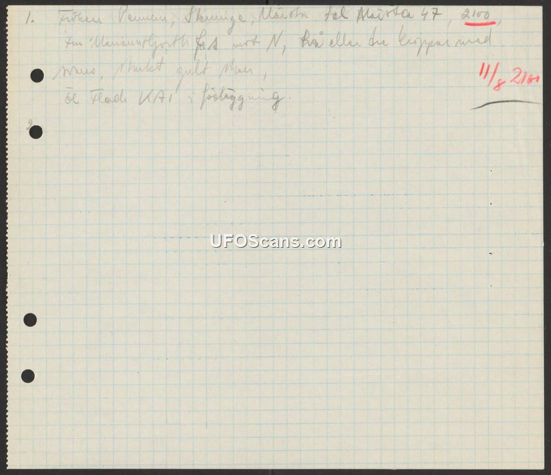 A brief handwritten report from August 11th detailing a sighting of a yellow object moving north in Mörön, Sweden. The report references KA1.