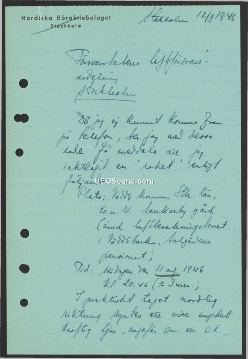 A report from a private company to the Swedish Defense Staff regarding a sighting of a 'rocket' with a powerful white light on August 11, 1946, in Vaddö, Sweden.