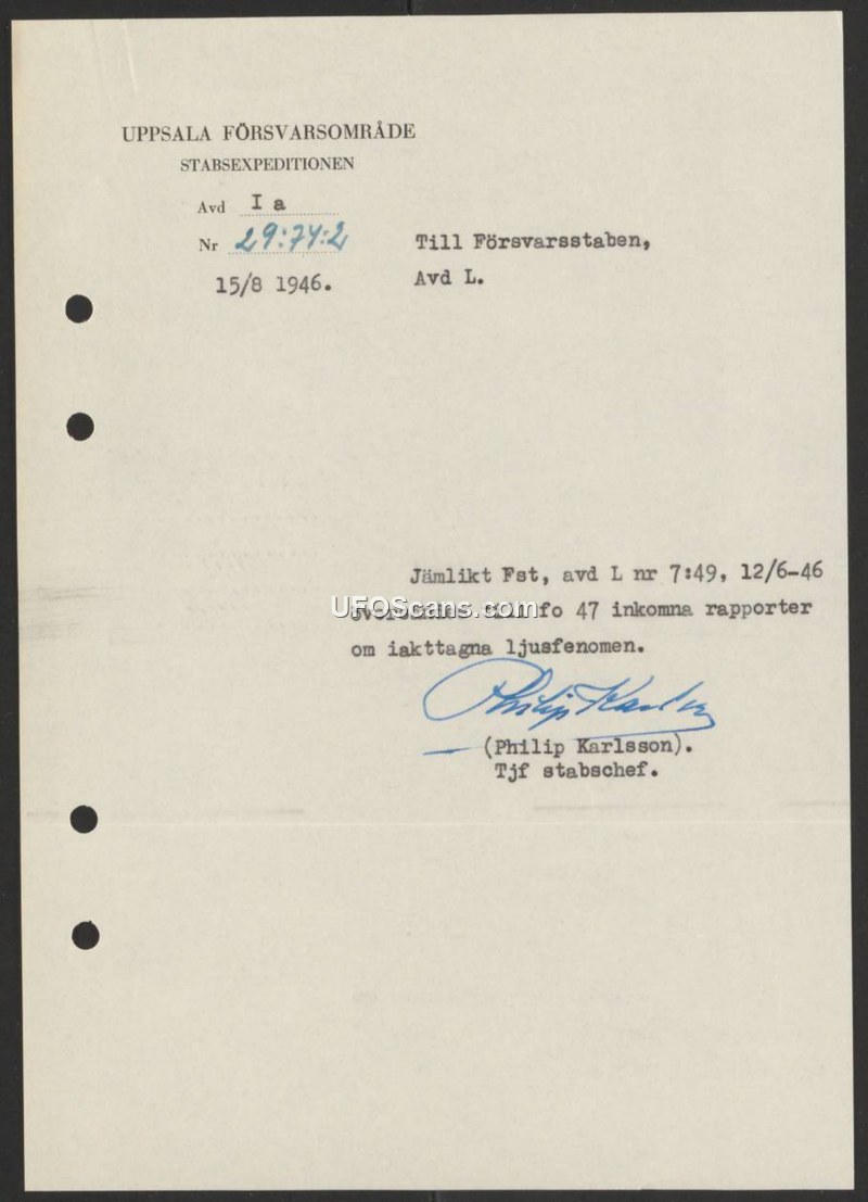 This document is a formal military communication dated August 15, 1946, issued by the Staff Expedition of the Uppsala Defense District in Sweden. Signed by Acting Chief of Staff Philip Karlsson, the memorandum serves as a transmittal record addressed to the Defense Staff, Section L. The primary purpose of the correspondence is to forward 47 reports that had been received by the Uppsala Defense District regarding observed light phenomena. The transmittal is explicitly linked to a previous directive, identified as Fst, avd L nr 7:49, dated June 12, 1946. The document provides no details regarding the nature, location, or specific characteristics of the light phenomena reported, functioning strictly as an administrative record of the transfer of these 47 reports between military departments.