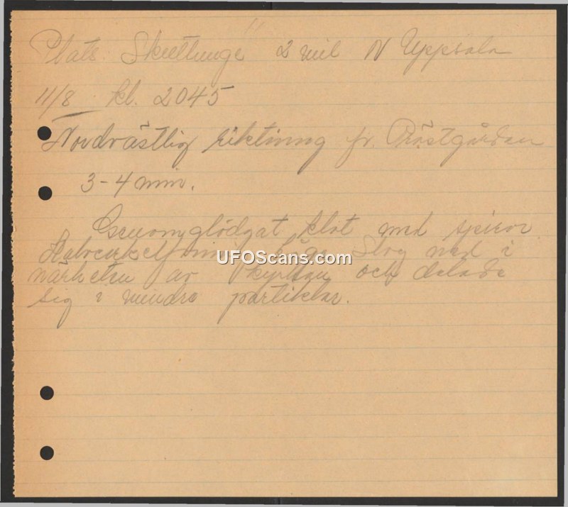 This handwritten document is a brief report of an aerial sighting that occurred on August 11 at 20:45. The location is identified as Skellunge, situated eight miles north of Uppsala, Sweden. The observer noted the object in a northeasterly direction from the rectory (Prästgården). The object is described as a glowing arc with a mirror-like appearance, measuring approximately 3-4 mm in size. The report states that the object descended near the church and subsequently split into smaller particles.