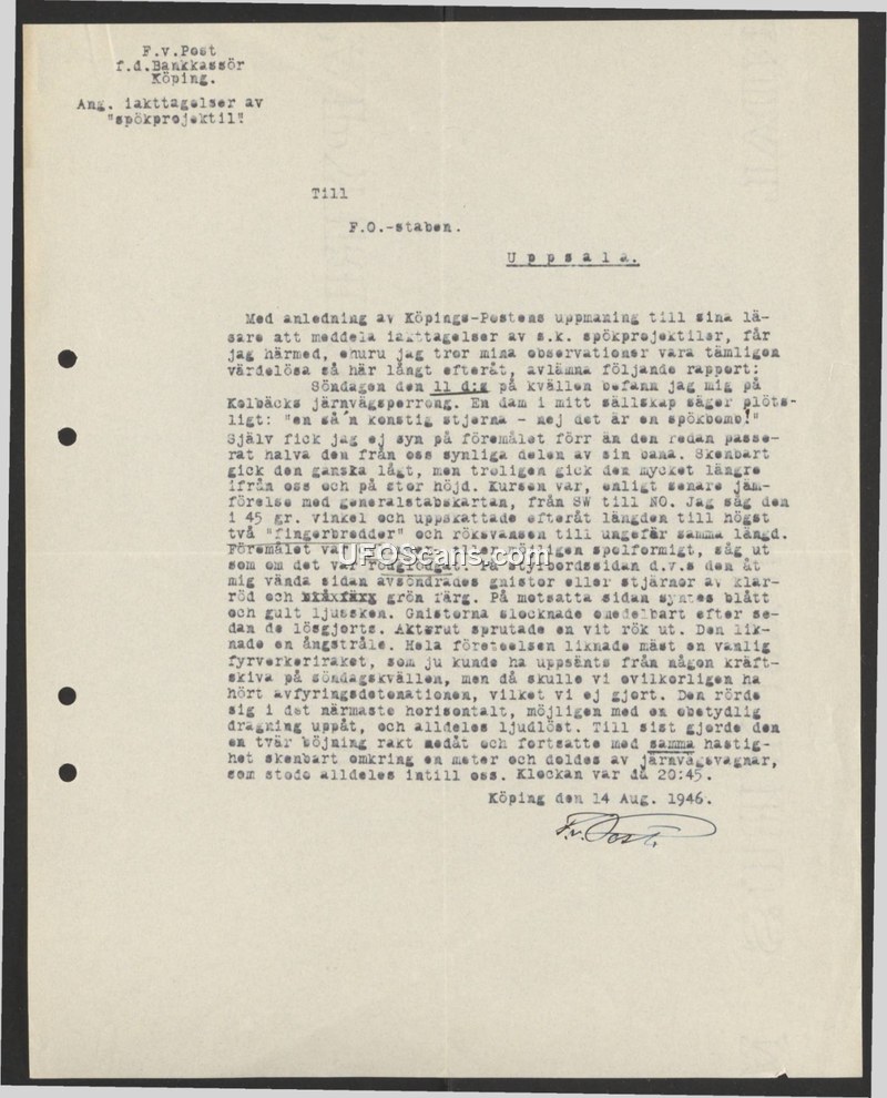 On August 14, 1946, F.V. Post, a former bank cashier from Köping, submitted a report to the Swedish Defense Staff (F.O.-staben) regarding a sighting of a 'ghost projectile' (spökprojektil). The incident occurred on the evening of Sunday, August 11, 1946, at the Kolbäcks railway platform. Post reports that a companion first noticed the object, exclaiming that it was a strange star or a 'ghost bomb.' Post observed the object as it passed by, noting it appeared to be traveling at a low altitude but likely at a significant distance. Based on a later comparison with a general staff map, the object's course was from the southwest to the northeast. Post estimated the object's length at two 'finger-widths' when viewed at a 45-degree angle. The object was described as cylindrical or spindle-shaped and appeared to be glowing red. On the side facing the witness, it emitted sparks or stars of clear red and green, while the opposite side displayed a blue and yellow light. The sparks extinguished shortly after detaching. The object also emitted a white smoke, which Post compared to a steam jet. While the phenomenon resembled a common firework rocket, Post noted that they did not hear any detonation, which would have been expected. The object moved in a nearly horizontal path, possibly with a slight upward trajectory, and was completely silent. Finally, it made a sharp turn downwards and continued at the same speed for about a meter before being obscured by railway cars standing nearby. The observation concluded at 20:45.