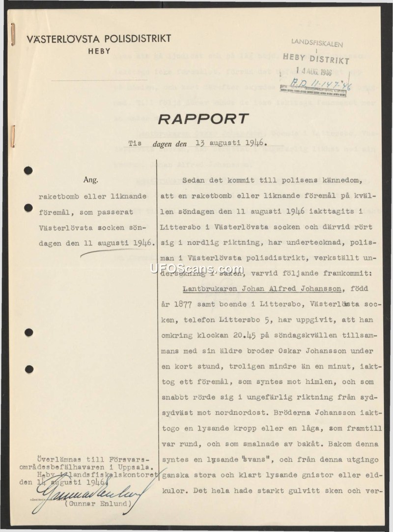 Rapport: Raketbomb eller liknande föremål, Västerlövsta socken, 11 augusti 1946