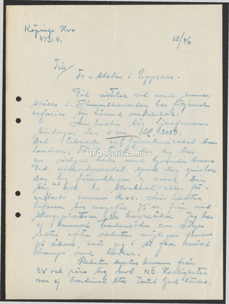 A report to the Swedish Defense Staff regarding a sighting of a red, rocket-like object that landed near Skinnskatteberg on August 11, 1946. The object scattered sparks upon landing and made no sound.