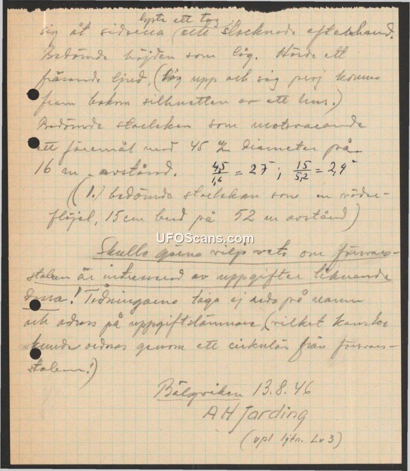This document is a handwritten report dated August 13, 1946, from Bälviken, authored by an individual identified as A.H. Jarding, holding the rank of Lieutenant (ltn. Lv 3). The author describes observing an unidentified object and hearing a hissing sound. The report includes mathematical calculations to estimate the size of the object, comparing it to a weather vane. Specifically, the author notes a diameter of 45 cm at a distance of 16 meters, and provides a secondary comparison of 15 cm at a distance of 52 meters. The author expresses an interest in knowing if the Swedish Defence Staff (Försvarsstaben) is interested in such information and notes that the newspapers do not currently have the names and addresses of the witnesses, though this could be arranged through the Defence Staff.