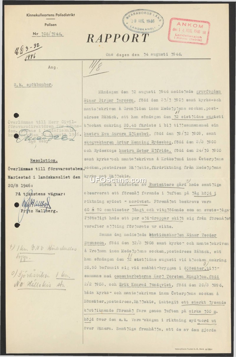 A 1946 Swedish police report detailing two separate eyewitness accounts of a glowing, low-altitude aerial object observed on August 12, 1946. The report was forwarded to the Swedish Defense Staff for further investigation.