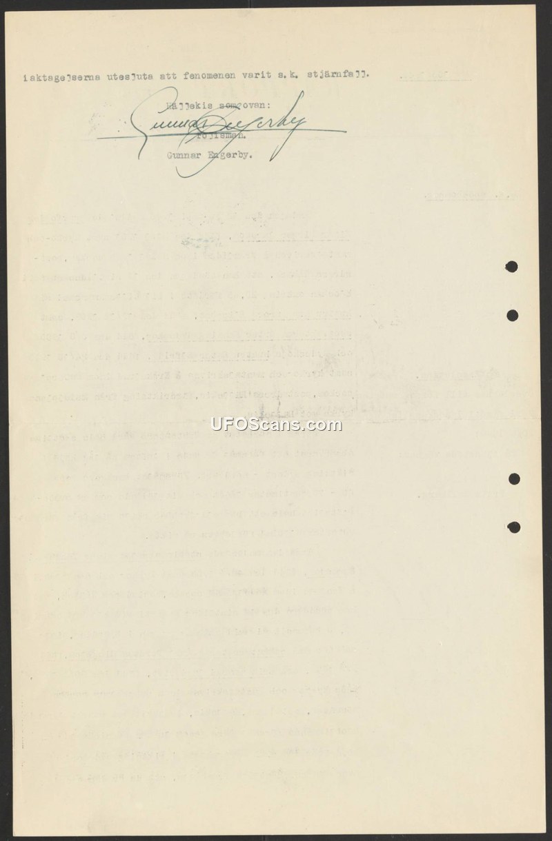 This document is a brief, signed statement by Gunnar Engerby regarding the observation of an unidentified phenomenon. The text explicitly states that the observations made rule out the possibility that the phenomenon was a 'starfall' or meteor. The document is written in Swedish and contains a signature from the author.