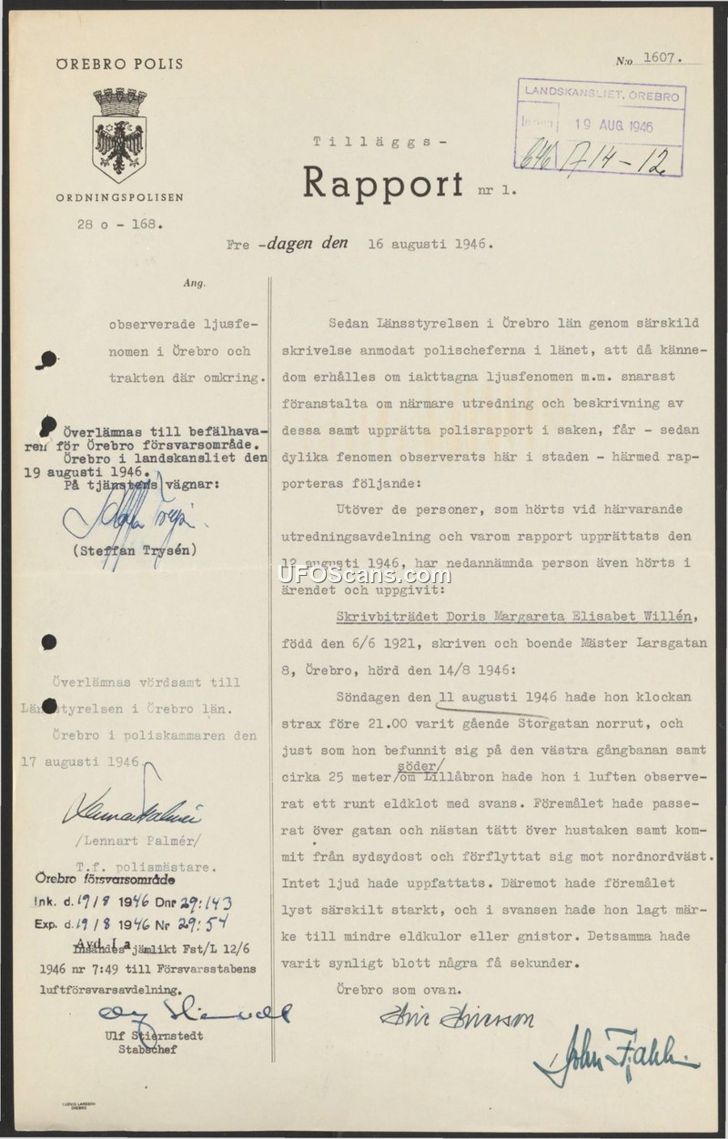 This document is a supplementary police report (nr 1) issued by the Örebro Police on August 16, 1946, regarding observed light phenomena in the Örebro region. The report was initiated following a directive from the County Administrative Board (Länsstyrelsen) in Örebro, which instructed police chiefs to investigate and document any reports of light phenomena. The report details the testimony of a clerical assistant, Doris Margareta Elisabet Willén, who was interviewed on August 14, 1946. She reported that on the evening of August 11, 1946, shortly before 21:00, she was walking north on Storgatan in Örebro. While near the Lillåbron bridge, she observed a round fireball with a tail in the sky. The object moved from the south-southeast toward the north-northwest, passing over the street and very close to the rooftops. She noted that the object emitted no sound but shone with a particularly strong light, and she observed smaller fireballs or sparks within the tail. The sighting lasted only a few seconds. The report was forwarded to the commander of the Örebro defense area and subsequently to the Air Defense Department of the Defense Staff.