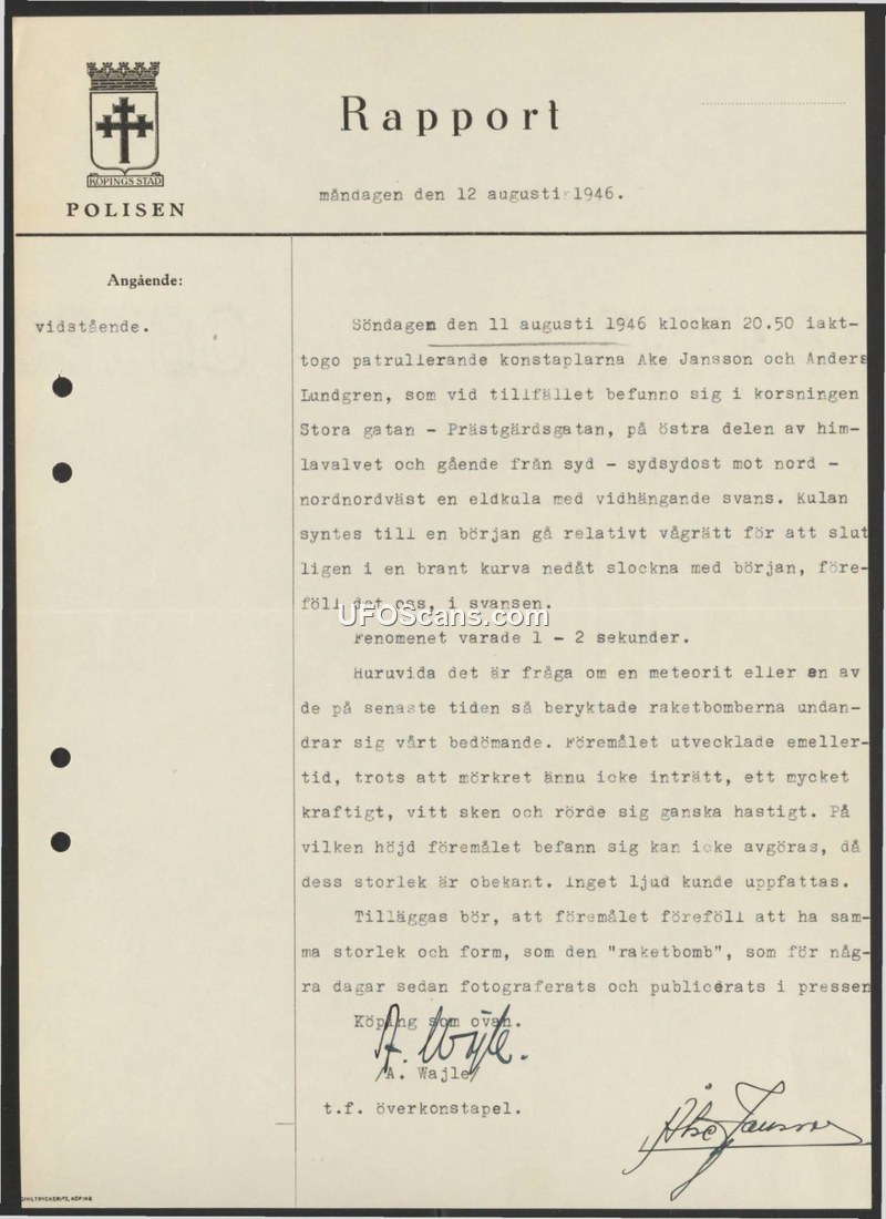 On August 12, 1946, a police report was filed in Köpings stad, Sweden, regarding an aerial sighting that occurred the previous evening. On Sunday, August 11, 1946, at 20:50, two patrolling police officers, Åke Jansson and Anders Lundgren, were at the intersection of Stora gatan and Prästgårdsgatan when they observed a phenomenon in the sky. The officers reported seeing a fireball with a tail moving from the south-southeast toward the north-northeast. The object initially traveled horizontally before descending in a steep curve and extinguishing. The entire event lasted between one and two seconds. Despite the fact that it was not yet dark, the object emitted a very bright, white light and moved quite rapidly. The officers noted that no sound was heard and that the object's altitude could not be determined due to its unknown size. The report explicitly compares the object's size and shape to a 'rocket bomb' that had been photographed and publicized in the press a few days prior. The author of the report, acting chief constable A. Wajle, concluded that it was impossible to determine whether the object was a meteorite or one of the 'rocket bombs' that had been the subject of recent rumors.
