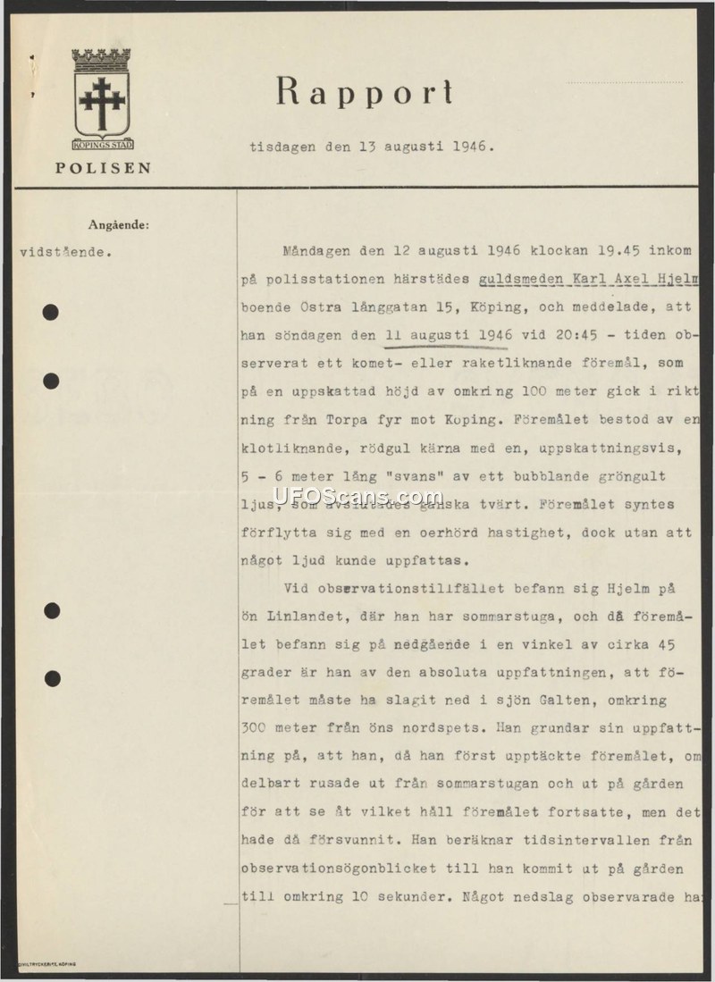 On August 13, 1946, the police in Köping, Sweden, filed a report regarding a sighting reported by a local goldsmith, Karl Axel Hjelm. Hjelm appeared at the police station on Monday, August 12, 1946, to report an incident he witnessed the previous evening, Sunday, August 11, at 20:45. According to Hjelm, he was at his summer cottage on the island of Linlandet when he observed a ball-like object moving at a tremendous speed. The object, which he described as having a red-yellow core and a 5-6 meter long tail of bubbling green-yellow light, traveled from the direction of Torpa lighthouse toward Köping at an estimated altitude of 100 meters. Hjelm noted that the object made no sound. He observed the object descending at an angle of approximately 45 degrees and formed the firm opinion that it had crashed into Lake Galten, about 300 meters from the northern tip of the island. Hjelm based this conclusion on the fact that he immediately rushed out of his cottage to see where the object was going, but it had already vanished. He estimated the time interval from his initial observation to reaching the yard was approximately 10 seconds. The report concludes by noting that no impact was observed.