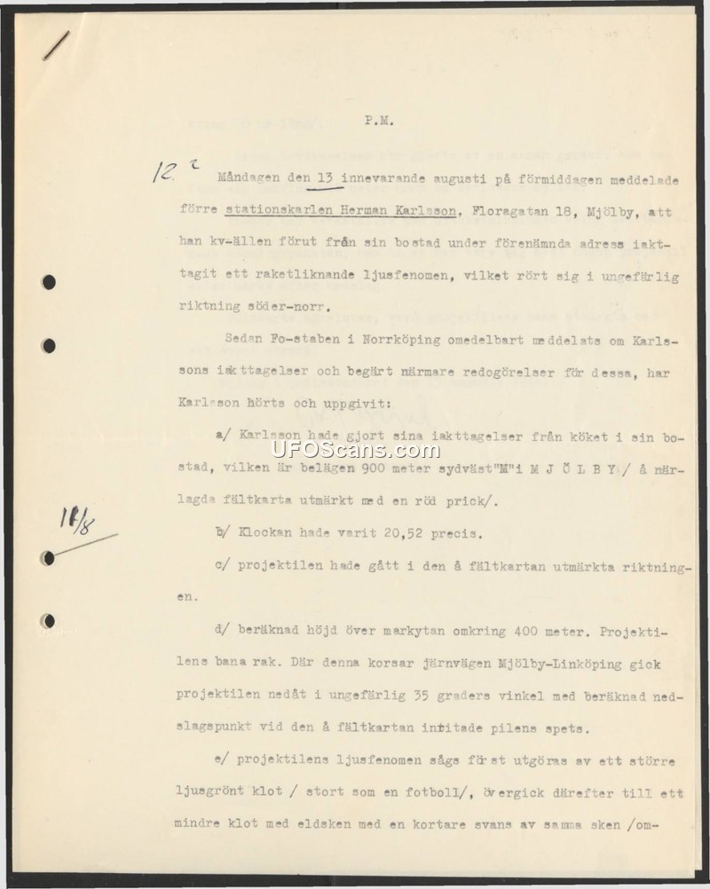 A memorandum detailing a sighting of a rocket-like light phenomenon by Herman Karlsson in Mjölby, Sweden, on August 13. The object was observed at 20:52, moving south-to-north at an altitude of 400 meters before descending.