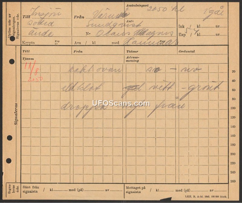 This document is a handwritten Swedish sighting report dated August 11th at 20:50. The report, involving individuals named Sundquist and Olaus Magnus, describes an aerial observation. The witness reports a fireball moving straight over the area, which appeared white-green in color. The report further notes that the object dropped something.