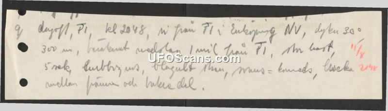 A handwritten report of a cone-shaped, blue-yellow aerial object sighted near Enköping, Sweden, on August 1st at 20:48. The object was observed at 300 meters altitude and performed a 30-degree dive.