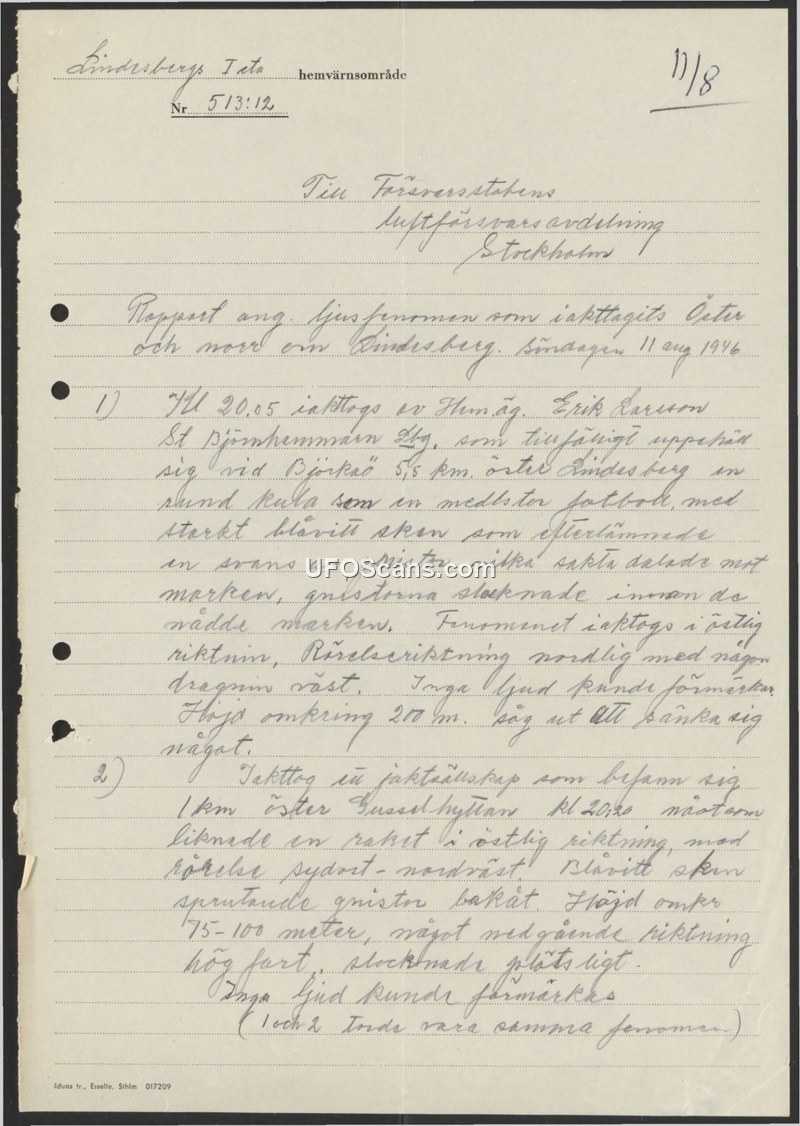 Report regarding light phenomena observed east and north of Lindesberg, Sunday 11 August 1946