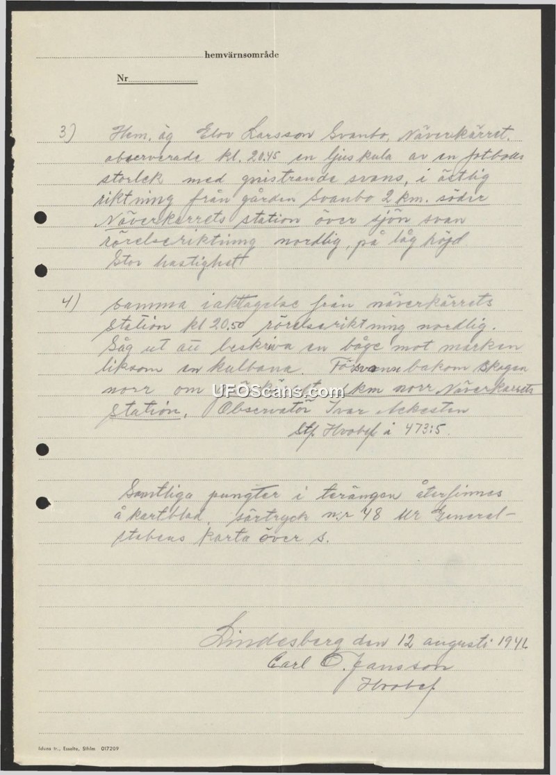 Sighting Report - Lindesberg, August 1946