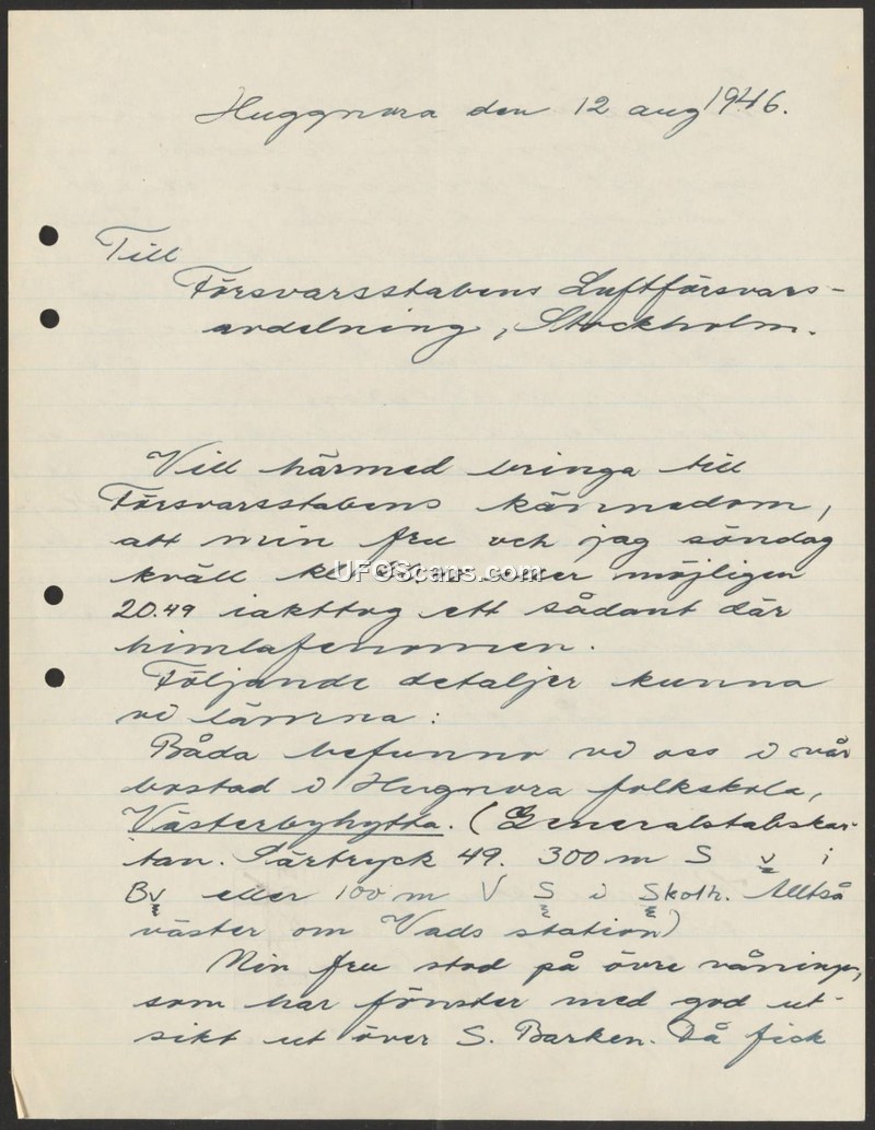 A letter from a Swedish citizen to the Defence Staff reporting an aerial sighting on August 11, 1946. The report specifies the time and location of the observation.