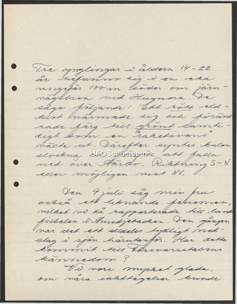 This document is a handwritten report detailing two separate sightings of an unidentified aerial phenomenon. The first incident involved three youths, aged 14 to 23, who were in a boat approximately 100 meters south of the railway at Hugnora. They reported observing a red light that approached them, changed color to green, and emitted a 'rocket-like tail.' Subsequently, the object appeared to extinguish and fall over the lake, moving in a south-to-north direction, possibly towards the north-west. The author of the document notes that on July 9, their wife observed a similar phenomenon, which was reported to the authorities in Smedjebacken. In that instance, there was a clear impact in the lake nearby. The author concludes by inquiring whether these observations have come to the attention of the Swedish Defence Staff (Försvarsstaben) and expresses a desire for their observations to be investigated.