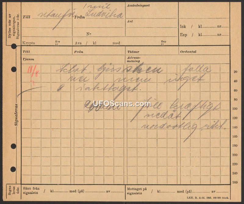 This document is a telegram originating from Ludvika, Sweden, dated August 11th. The text provides a brief report regarding an observation of an object. The message states that an object was observed falling in a northeast direction. No further details regarding the nature, size, or origin of the object are provided in the text.