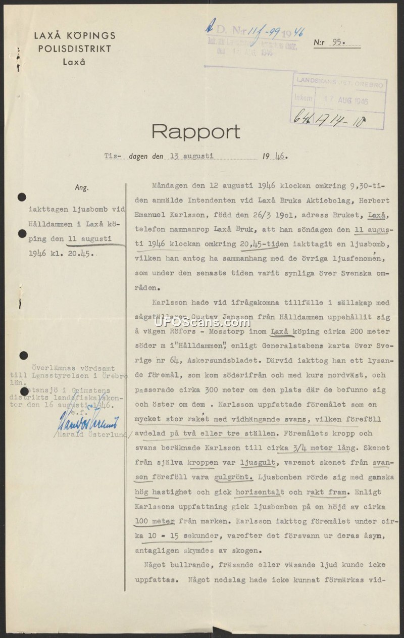 On August 13, 1946, the Laxå Köping Police District issued a report regarding a sighting of a 'light bomb' (ljusbomb) that occurred on the evening of August 11, 1946. The report was filed by Herbert Emanuel Karlsson, an intendant at Laxå Bruks Aktiebolag, who witnessed the event at approximately 20:45. Karlsson was accompanied by a saw operator named Gustav Jansson while they were on the road between Röfors and Mosstorp, approximately 200 meters south of Hålldammen. According to Karlsson, he observed a luminous object traveling from the south toward the northwest, passing about 300 meters from their location. He described the object as a very large rocket with a tail that appeared to be divided into two or three sections. The total length of the object and its tail was estimated at approximately 0.75 meters. The body of the object emitted a light-yellow glow, while the tail appeared yellow-green. The object moved at a high speed in a horizontal, straight path at an estimated altitude of 100 meters. The observation lasted between 10 and 15 seconds before the object disappeared from sight, presumably obscured by the forest. No sound, such as roaring, hissing, or whistling, was detected, and no impact was observed. Karlsson noted that he believed this sighting was related to other light phenomena recently reported over Swedish territory.
