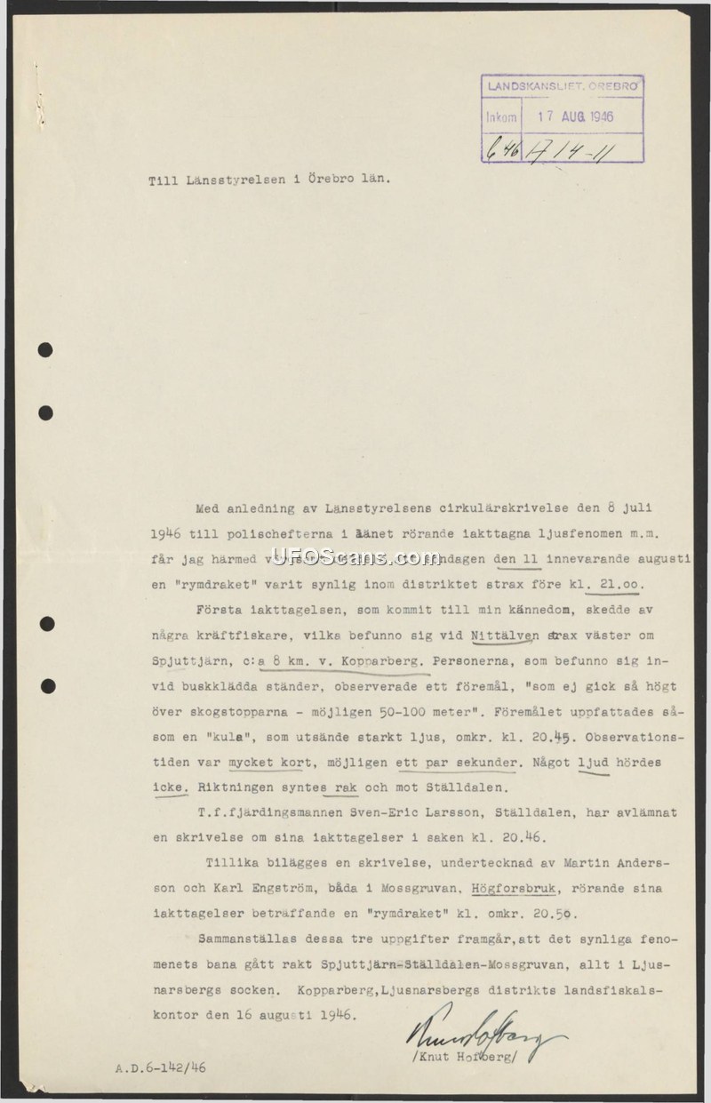 This document is a formal report dated August 16, 1946, from the Ljusnarsberg District Landsfiskal office to the County Administrative Board of Örebro. It responds to a circular letter issued on July 8, 1946, regarding observations of light phenomena. The author, Knut Hofberg, reports that a 'space rocket' was observed in the district on the evening of August 11, 1946, shortly before 21:00. The report details three separate accounts. The first observation was made by crayfish fishermen near Nittälven, west of Spjuttjärn. They described a ball-shaped object emitting strong light, flying at an altitude of approximately 50-100 meters. The observation lasted only a few seconds, and no sound was heard. The object appeared to move in a straight line toward Ställdalen. Additionally, the report notes that Acting Fjärdingsman Sven-Eric Larsson of Ställdalen submitted a written account of his observations at 20:46. Finally, the report includes a statement from Martin Andersson and Karl Engström of Mossgruvan, who observed the object around 20:50. By synthesizing these accounts, the author concludes that the object's trajectory followed a path from Spjuttjärn to Ställdalen and then to Mossgruvan, all within the Ljusnarsberg parish.