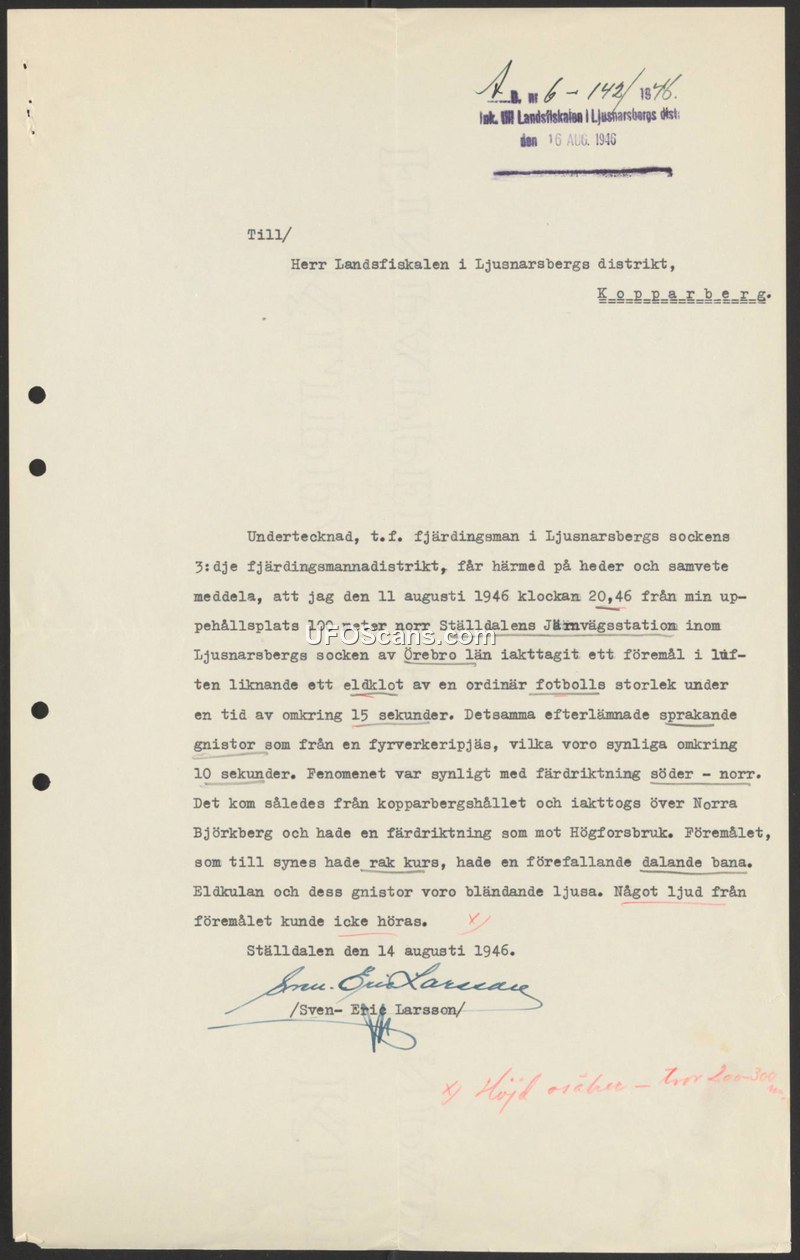 On August 14, 1946, Sven-Erik Larsson, a temporary constable (t.f. fjärdingsman) in the Ljusnarsbergs district, filed a formal report regarding an aerial phenomenon he witnessed on August 11, 1946. At 20:46, while located 100 meters north of the Ställdalen railway station, Larsson observed an object in the sky that he described as a fireball, roughly the size of an ordinary football. The object was visible for approximately 15 seconds and emitted crackling sparks, similar to a firework, which remained visible for about 10 seconds. The phenomenon moved in a south-to-north direction, passing over Norra Björkberg with a trajectory toward Högforsbruk. Larsson noted that the object appeared to follow a straight, descending path. Both the fireball and its sparks were described as blindingly bright, though the object made no audible sound. A handwritten annotation on the document provides an estimated altitude of 200-300 meters. The report was addressed to the district prosecutor (Landsfiskalen) in Ljusnarsberg.