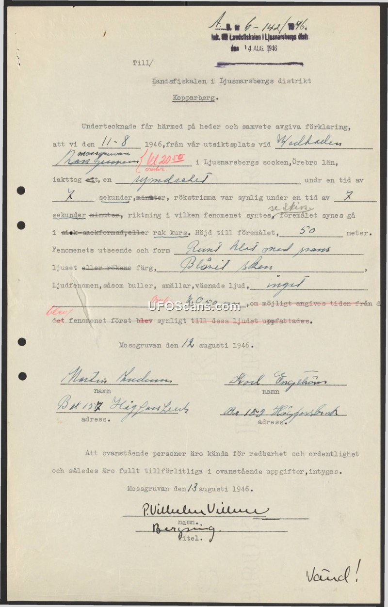 A 1946 Swedish police report documenting a sighting of a blue, spherical object with a tail observed by two witnesses in Mossgruvan. The report includes a formal attestation of the witnesses' credibility by a local official.