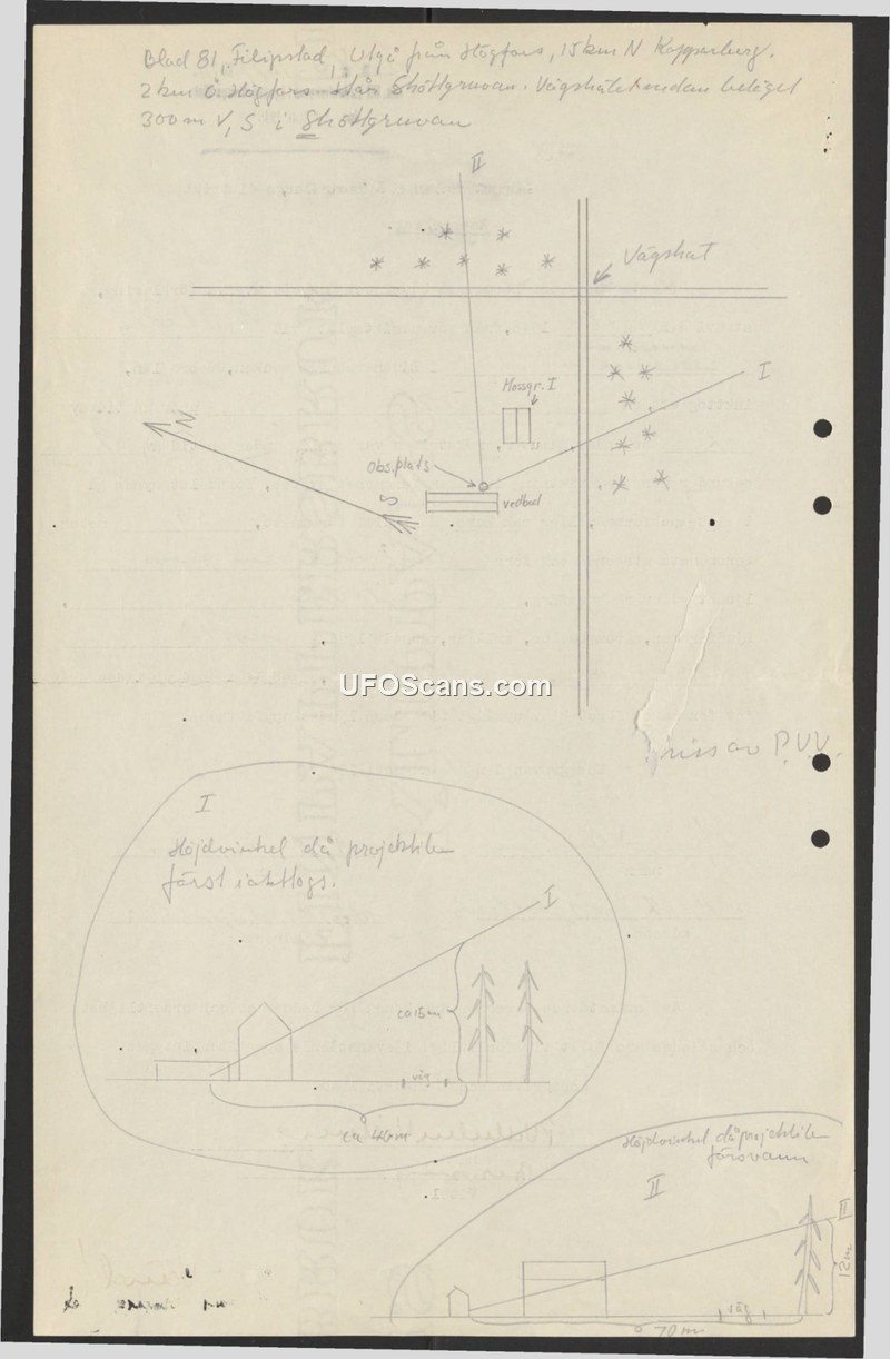 A technical field report from Sweden detailing the geometric reconstruction of a projectile sighting near Shottgruvan. It includes hand-drawn diagrams calculating elevation angles and relative distances from an observation point.