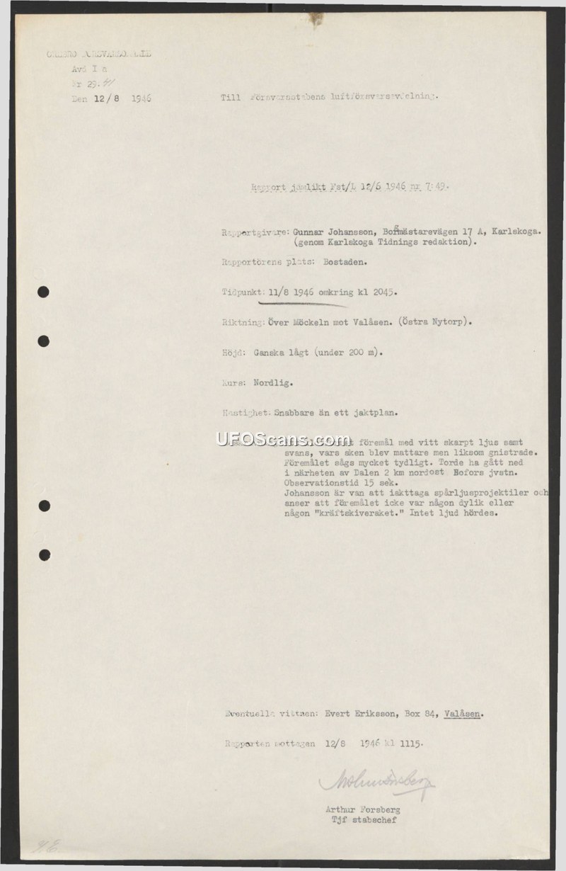 A report from August 1946 detailing a sighting of a fast-moving, ball-shaped aerial object with a tail near Karlskoga, Sweden. The witness, an experienced observer, ruled out conventional projectiles.