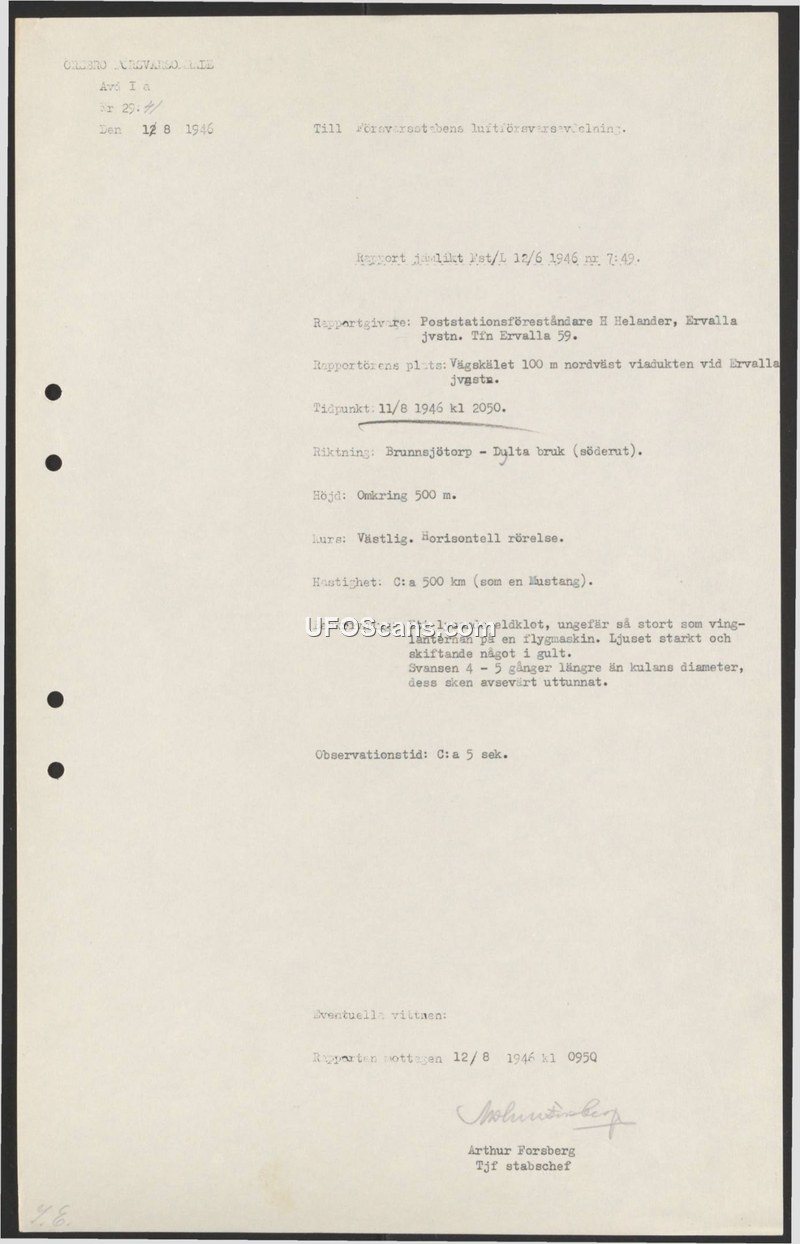 A 1946 Swedish military report documenting a sighting of a luminous fireball near Ervalla railway station. The object was observed moving at an estimated 500 km/h at an altitude of 500 meters.