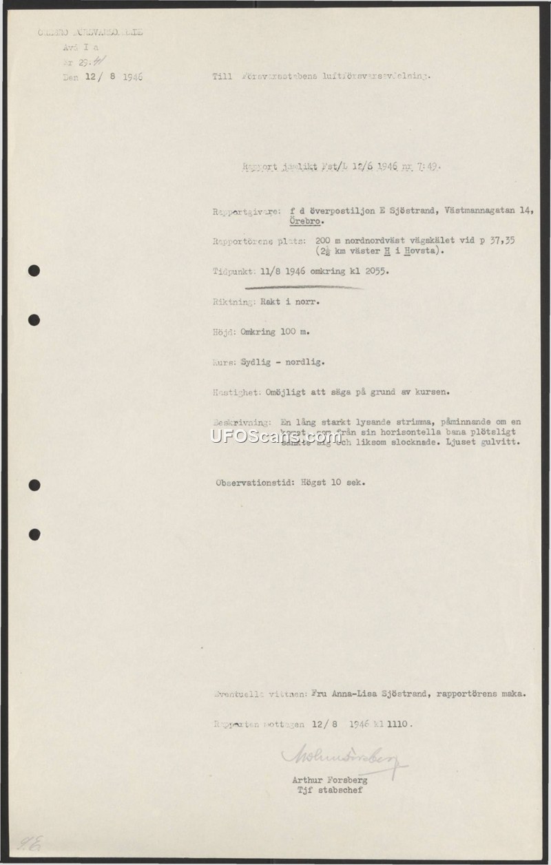 On August 12, 1946, the Swedish Defense Staff's Air Defense Department (Försvarsstabens luftförsvarsavdelning) received a report regarding an aerial observation made the previous evening. The primary witness, former postal official E Sjöstrand, reported that on August 11, 1946, at approximately 20:55, he observed an object while located 200 meters north-northwest of the intersection at point 37,35, approximately 2.5 kilometers west of Hovsta. The witness described the object as a long, brightly glowing streak, reminiscent of a comet. The object was traveling on a south-to-north course at an estimated altitude of 100 meters. The witness noted that the object suddenly descended from its horizontal path and appeared to extinguish itself. The light was described as yellowish-white. The entire observation lasted no more than 10 seconds. The witness's wife, Anna-Lisa Sjöstrand, was also present as a witness. The report was processed and signed by Arthur Forsberg, acting Chief of Staff, on August 12, 1946.