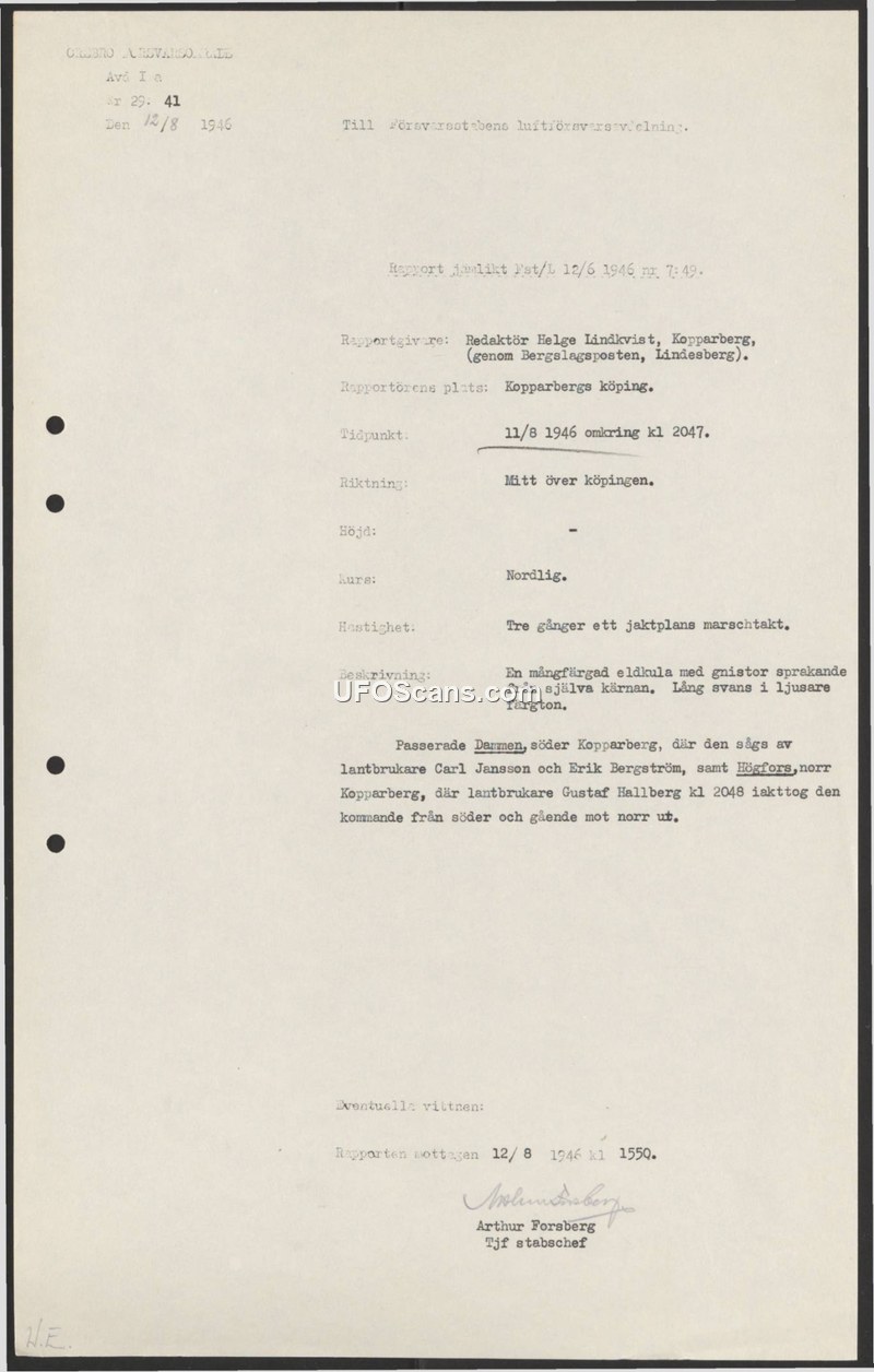 This document is a formal sighting report filed with the Swedish Defense Staff's Air Defense Department on August 12, 1946. The report details an aerial observation made on August 11, 1946, at approximately 20:47. The primary witness and reporter is identified as editor Helge Lindkvist of Kopparberg, who provided the information via the newspaper Bergslagsposten. The object was described as a multi-colored fireball with a long tail of a lighter shade, emitting sparks from its core. It was observed moving at a speed estimated to be three times that of a fighter plane's cruising speed. The object was sighted over the town of Kopparberg, moving in a northerly direction. Additional witnesses, identified as farmers Carl Jansson and Erik Bergström, observed the object as it passed over Dammen, south of Kopparberg. A third witness, farmer Gustaf Hallberg, observed the object at 20:48 in Högfors, north of Kopparberg, confirming its trajectory from the south toward the north. The report was received and signed by Arthur Forsberg, acting chief of staff.