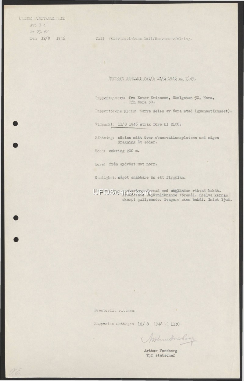This document is a formal sighting report issued by the Örebro Defense Area (Örebro Försvarsområde) on August 12, 1946, addressed to the Air Defense Department of the Defense Staff. The report details an observation made by Mrs. Ester Ericsson of Nora, Sweden, on the evening of August 11, 1946, shortly before 21:00. Mrs. Ericsson, who was located at the gymnasium in the northern part of Nora, observed an unidentified aerial object traveling from the southwest toward the north. The object was described as sugarloaf-shaped with its tail end directed backward. It was noted to be emitting a sharp yellow light, with a weaker light visible toward the rear. The witness reported that the object emitted star-like items and traveled at a speed slightly faster than an airplane at an altitude of approximately 200 meters. The report explicitly states that there was no sound associated with the object. The document was received and signed by Arthur Forsberg, acting Chief of Staff.