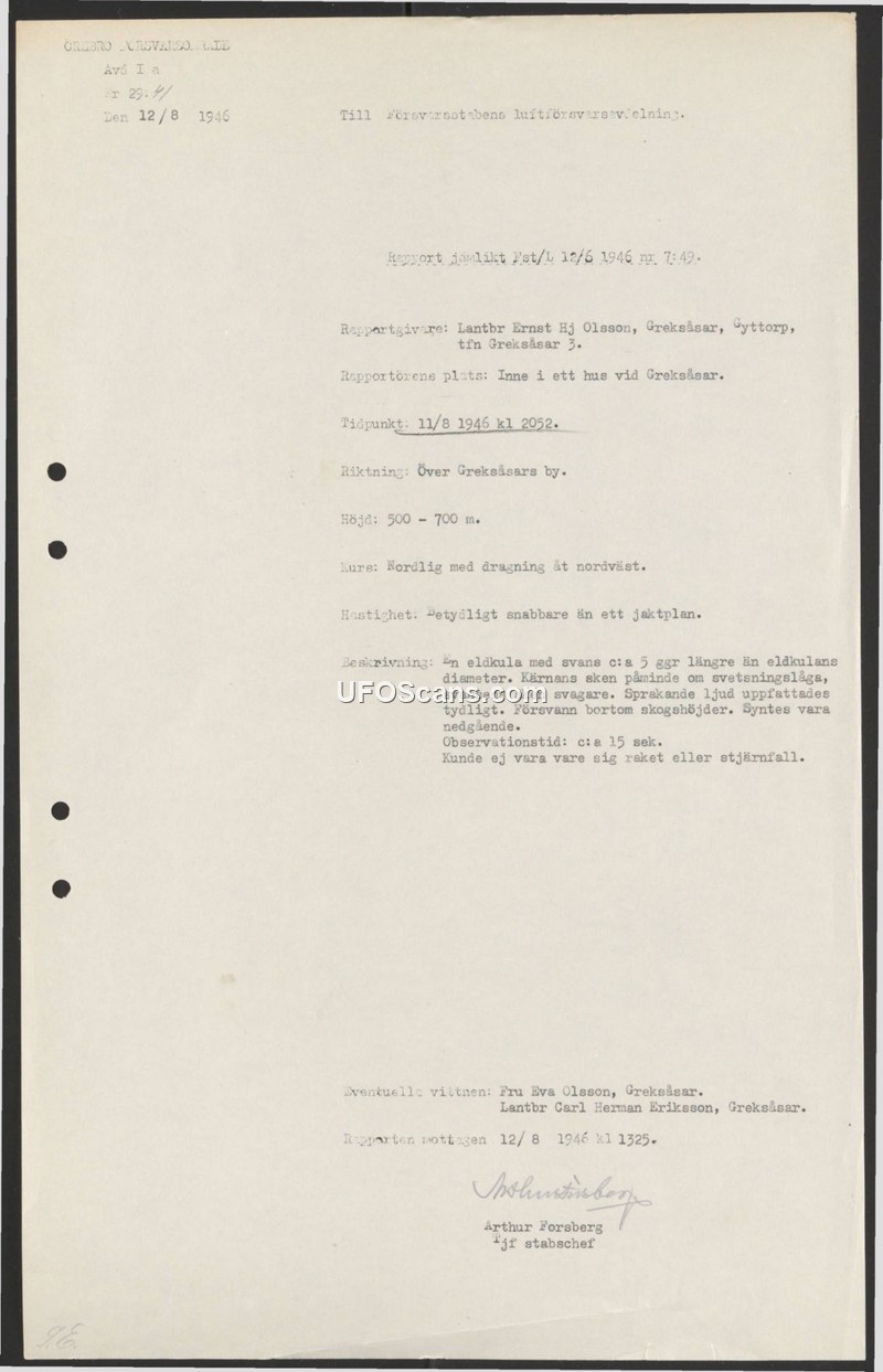 Rapport angående observation av eldkula, Greksåsar, 11 augusti 1946