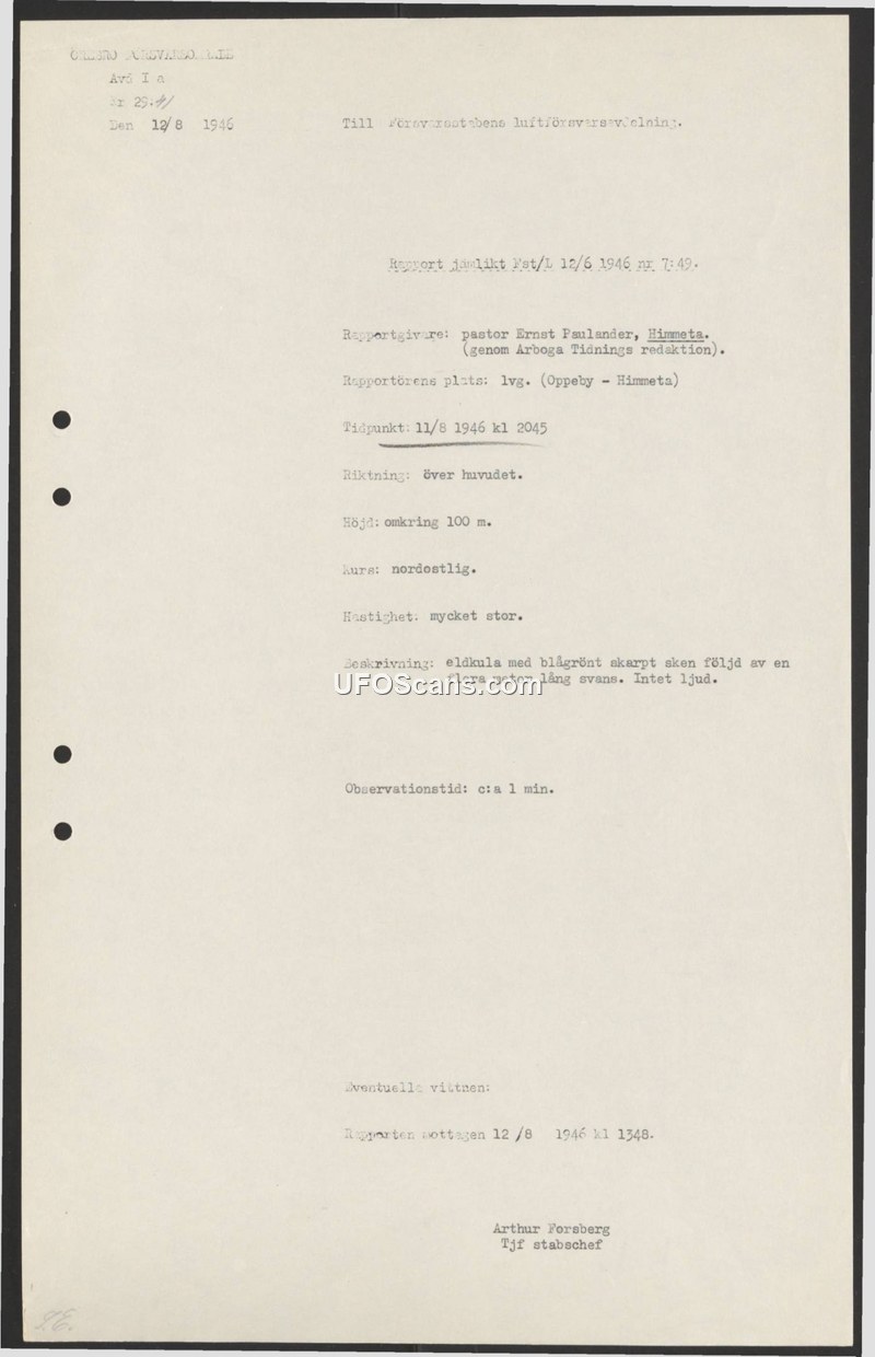 Sighting Report — Himmeta, Sweden, August 11, 1946