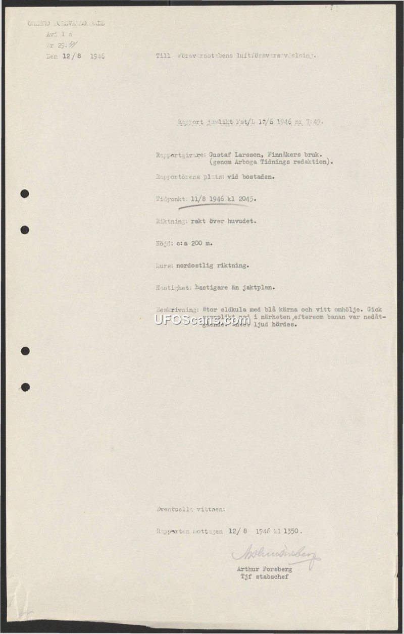 On August 12, 1946, the Swedish Defense Staff's Air Defense Department (Försvarsstabens luftförsvarsavdelning) recorded a report regarding an aerial sighting that occurred on the evening of August 11, 1946. The report was provided by Gustaf Larsson of Finnåkers bruk, who submitted his account through the editorial office of the Arboga Tidning newspaper. According to the document, at 20:45, a fireball was observed directly overhead at an estimated altitude of 200 meters. The object was described as having a blue core with a white casing. It was traveling in a northeasterly direction at a speed described as faster than a fighter plane. The witness noted that the object's trajectory was downward, suggesting it likely landed in the vicinity. No sound was heard during the event. The report was received by the military authorities on August 12, 1946, at 13:50, and signed by Arthur Forsberg, acting chief of staff.