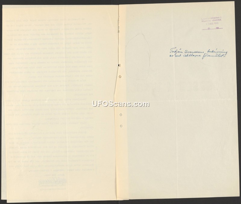 This document is a brief administrative record from the Kumla district in Sweden, dated August 12, 1946. The document contains a handwritten note in Swedish, which translates to 'Torbjörn Svensson's description of the unknown object.' The document serves as a record or cover sheet for a statement provided by an individual named Torbjörn Svensson regarding an unidentified object.