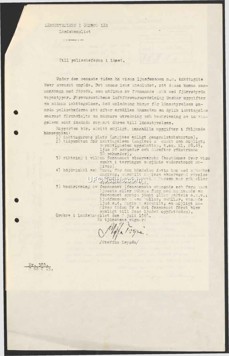 A 1946 Swedish administrative directive instructing police to report 'light phenomena' to the Defense Staff. The government suspected these sightings might be linked to foreign remote-controlled weapons.
