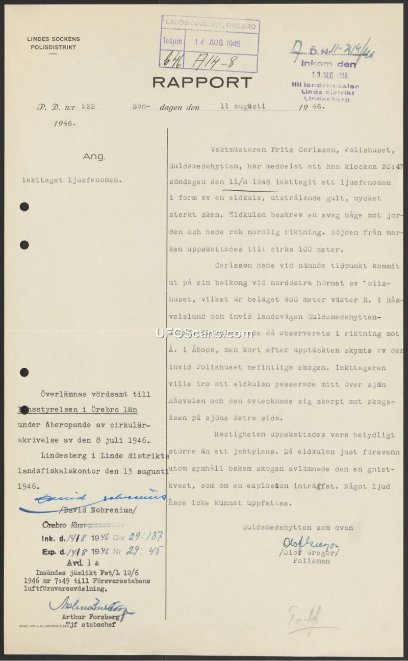 On August 11, 1946, at 20:47, Fritz Carlsson, a caretaker at the police station in Guldsmedshyttan, Sweden, observed a luminous phenomenon. He described the object as a fireball emitting a strong yellow light. The object traveled in a weak arc toward the ground, maintaining a straight northern trajectory at an estimated altitude of 100 meters. Carlsson, who was on his balcony at the time, noted that the object appeared to pass over the lake Råsvalen and was silhouetted against the forest ridge on the eastern side of the lake. He estimated the speed of the object to be significantly faster than that of a fighter plane. As the object disappeared from view behind a forest, it emitted a spray of sparks, as if an explosion had occurred, though no sound was heard. This report was filed by Police Officer Olof Gregor on August 13, 1946, and subsequently forwarded to the County Administrative Board in Örebro and the Air Defense Department of the Defense Staff.