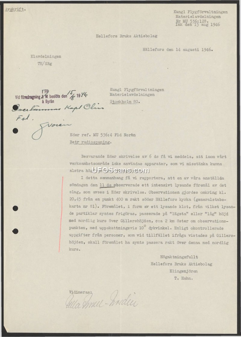 A 1946 letter from Hellefors Bruks Aktiebolag to the Swedish Royal Air Force Administration denying radio interference and reporting a sighting of a glowing, particle-emitting aerial object.