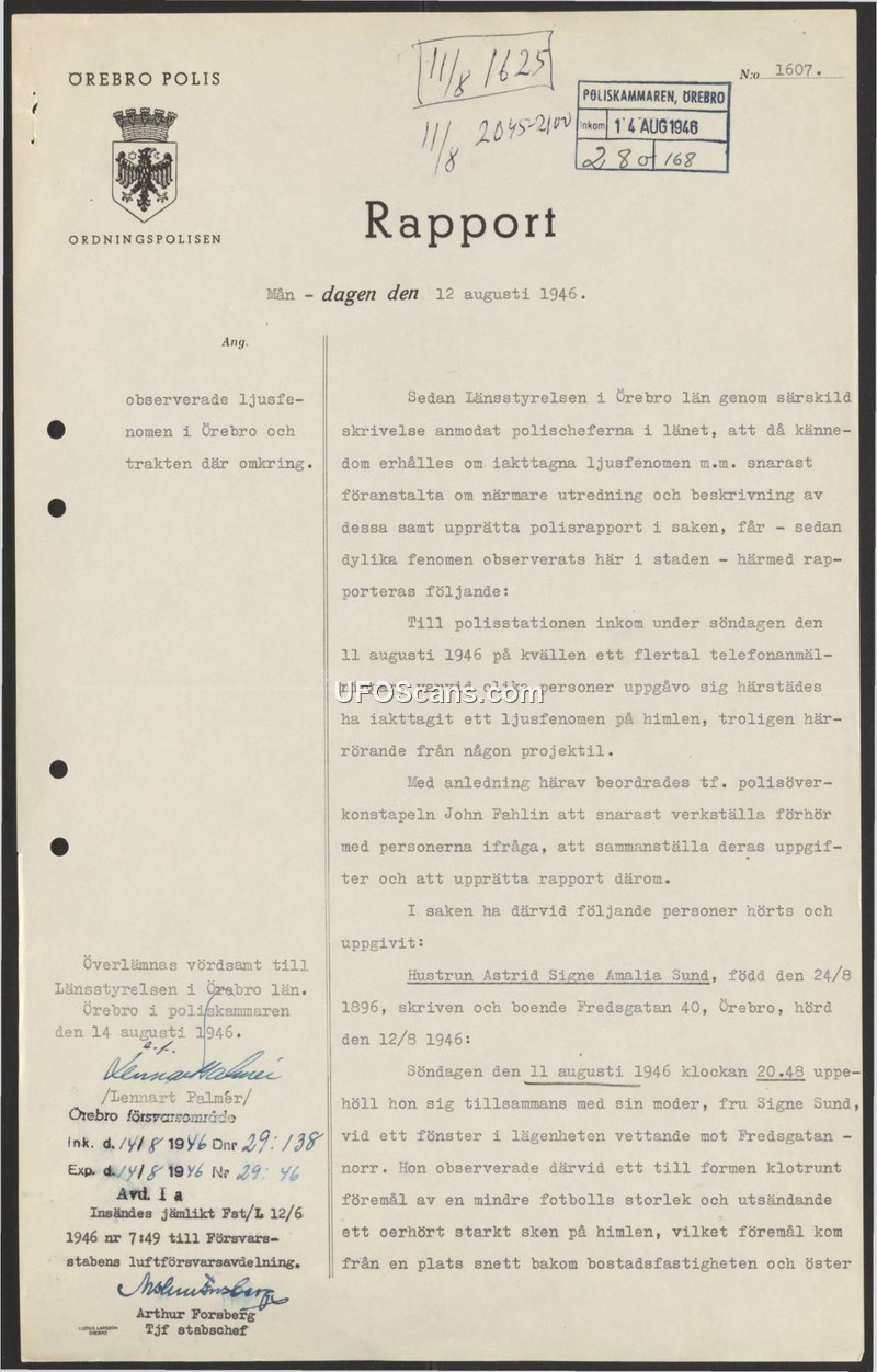 A 1946 Swedish police report documenting a civilian sighting of a spherical, brightly lit object in Örebro. The report was forwarded to military authorities for further investigation.