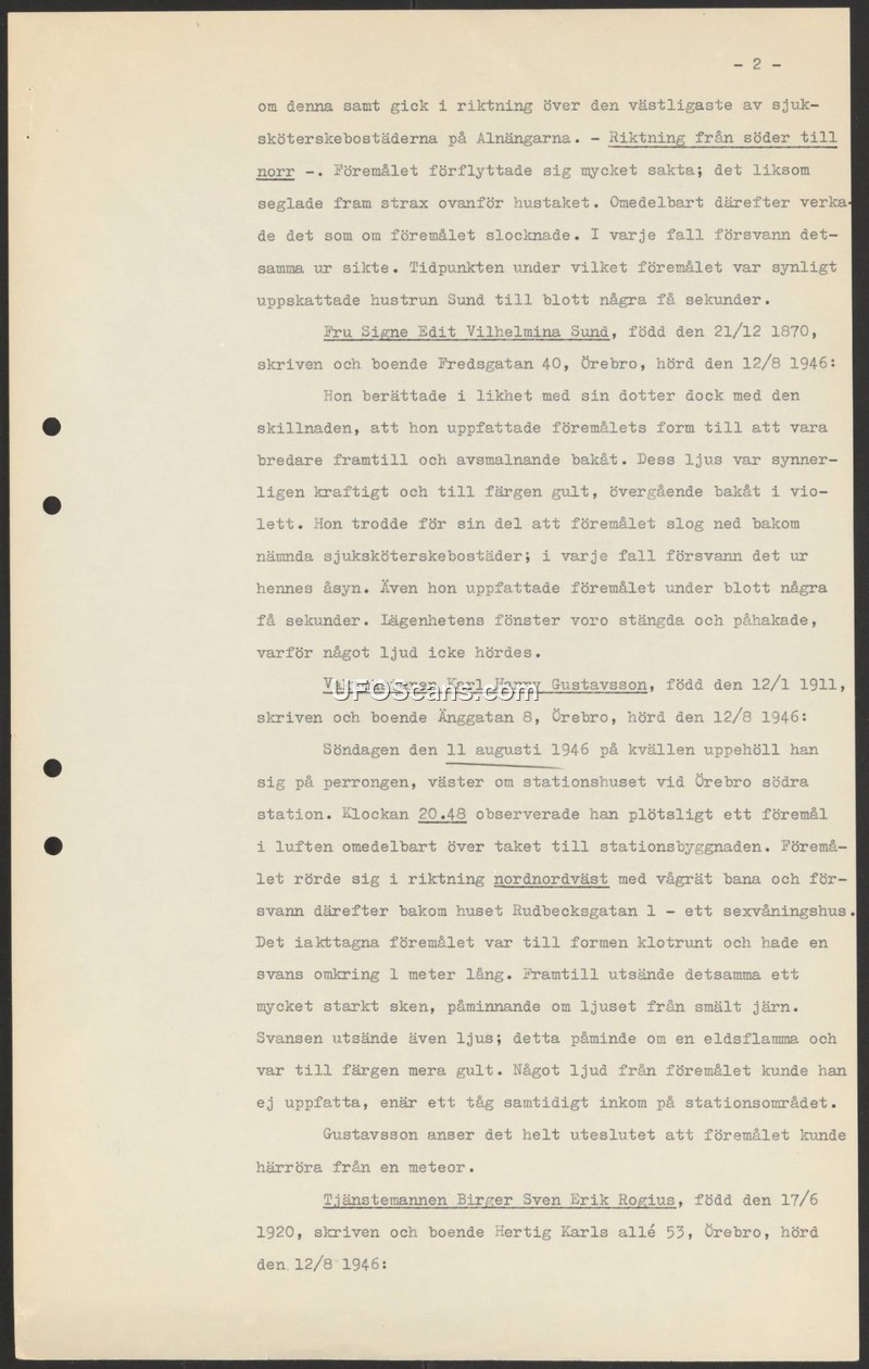 This document contains transcribed testimony from three individuals—Signe Edit Vilhelmina Sund, Karl Harry Gustavsson, and Birger Sven Erik Ronius—regarding an aerial sighting that occurred on the evening of August 11, 1946, in Örebro, Sweden. The testimonies were recorded on August 12, 1946. Karl Harry Gustavsson, a caretaker, reported observing an object at 20:48 while on the platform at the Örebro Södra station. He described the object as round with a tail approximately one meter long. He noted that the front of the object emitted a very strong light, which he compared to the glow of molten iron, while the tail emitted a yellow light resembling a flame. The object moved in a north-northwesterly direction at a very slow speed, sailing just above the roof of the station building before disappearing behind a six-story building on Rudbecksgatan 1. Gustavsson stated that he could not hear any sound from the object because a train was entering the station at the same time, and he explicitly dismissed the possibility that the object was a meteor. Signe Edit Vilhelmina Sund, who was interviewed alongside her daughter, provided a similar account, noting that the object appeared wider at the front and tapered toward the back. She described the light as intense, yellow in color, and transitioning to violet at the rear. She observed the object for only a few seconds before it disappeared behind the nurses' residences at Alnängarna. She noted that her windows were closed, which prevented her from hearing any potential sound. The document serves as a formal record of these eyewitness accounts.