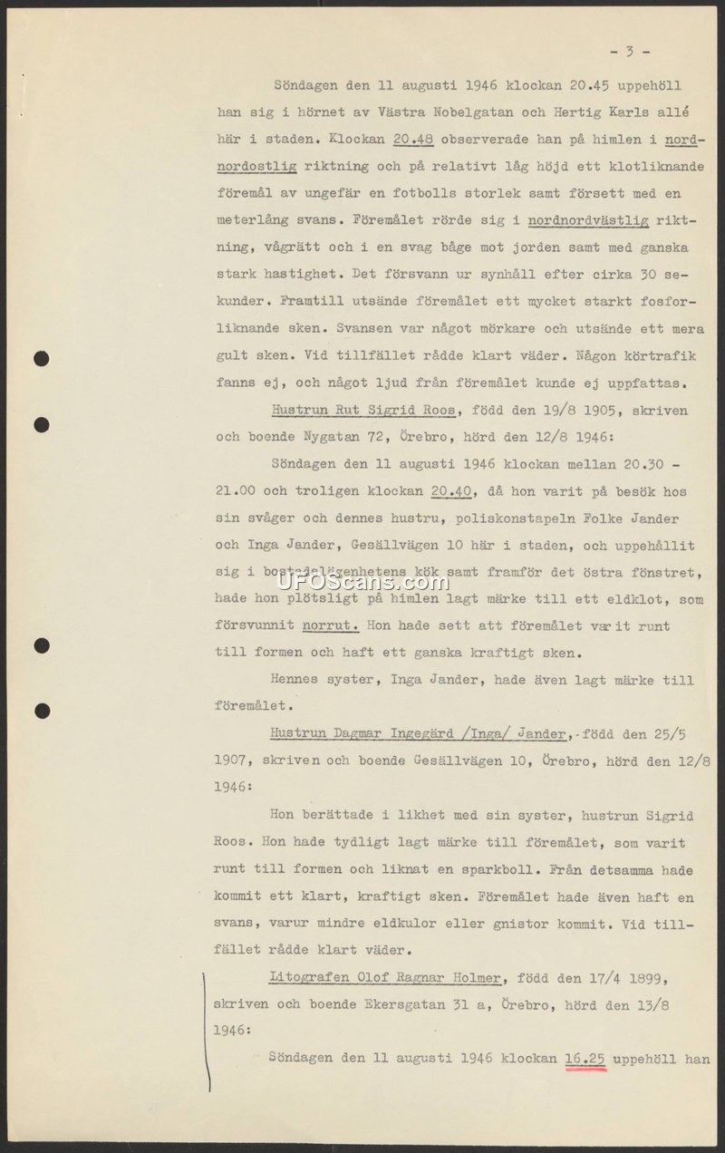 Sighting Incident Reports — Örebro, Sweden, August 1946