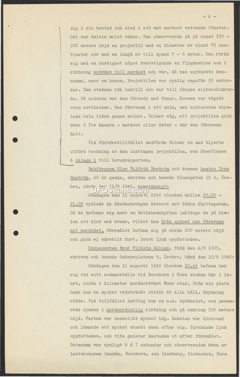 This document is a page from a report detailing multiple sightings of unidentified aerial objects in Sweden on August 11, 1946. The first account describes an individual named Holmer who observed a projectile from his home. He estimated the object to be 7-8 meters long with a diameter of at least 75 centimeters, featuring fins and a silvery, shimmering appearance. It moved at a speed faster than an airplane, emitting smoke from the rear, and traveled from the southwest to the northeast at an altitude of 150-200 meters before disappearing into a cloud near the I 3 barracks. A second report involves Olov Valfrid Boström and his wife, Tyra, who observed a spherical object with a tail moving from the southeast to the northwest at an altitude of approximately 200 meters between 20:50 and 21:00. They reported no sound. A third account from Bror Vilhelm Eklund describes a 'ghost rocket' observed at 20:45 near Nora. Eklund noted the object was spherical, moved at a very high speed in a north-northeasterly direction at an altitude of 300 meters, emitted a strong light, and produced a crackling sound with white sparks. This sighting was corroborated by two local farmers, Zandén and Lindberg. The document notes that Holmer provided a pencil sketch of his observation, which was attached to the main report as Appendix 1.